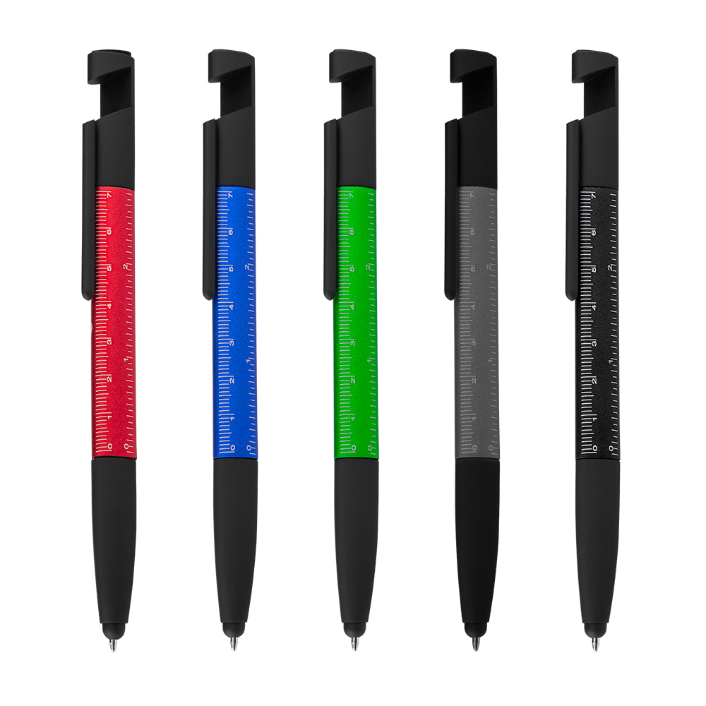 Caneta esferográfica metálica com escrita azul, ponta touch e funções integradas: chave de Fenda e Phillips, Suporte para smartphone, limpador de tela no acionador e régua no corpo da caneta.