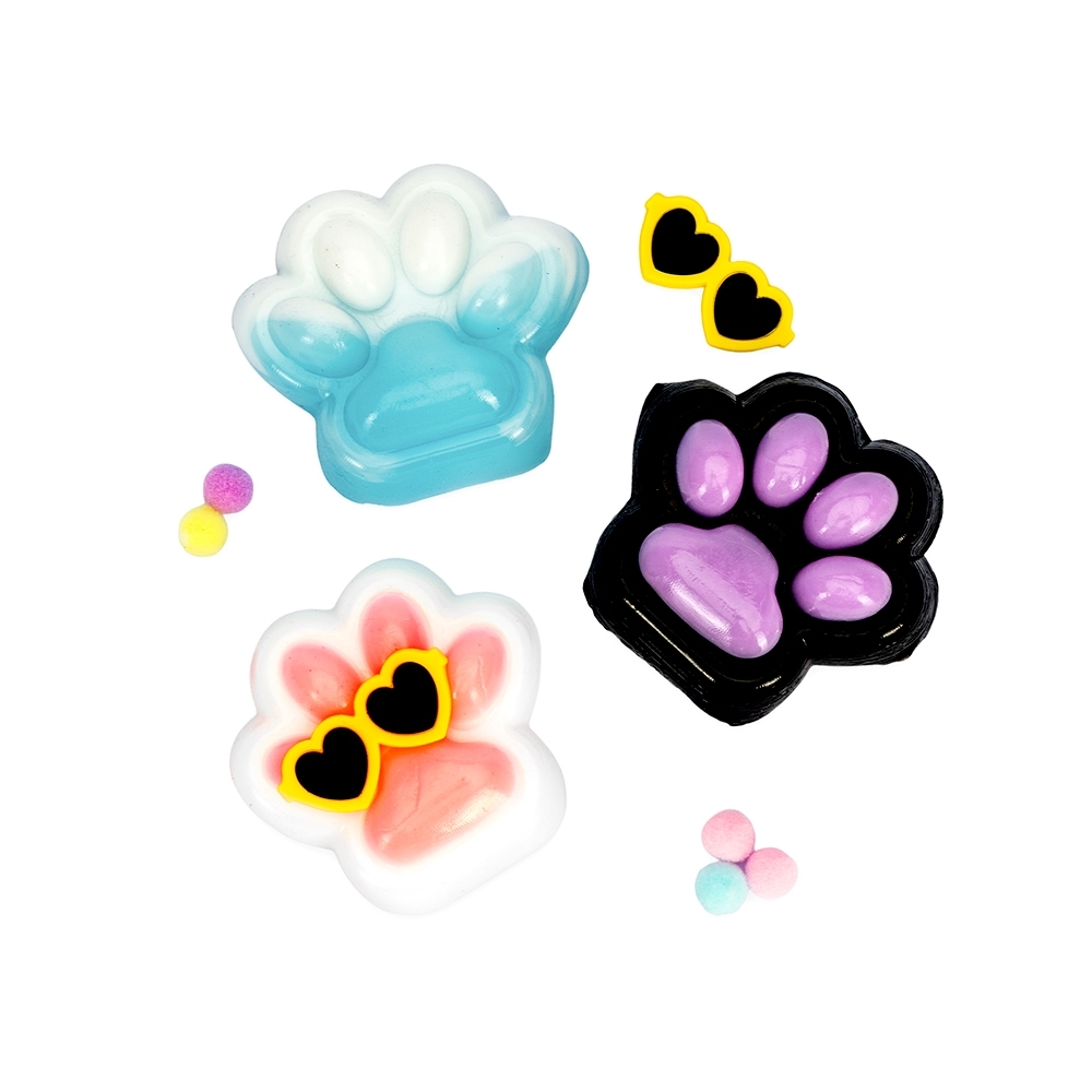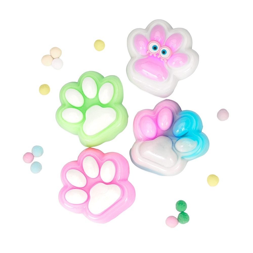 Brinquedo apertável antiestresse em formato de pata estilizada, produzido em borracha termoplástica lisa e macia. Adere facilmente a superfícies planas e acompanha bolinhas de pelúcia para decoração.