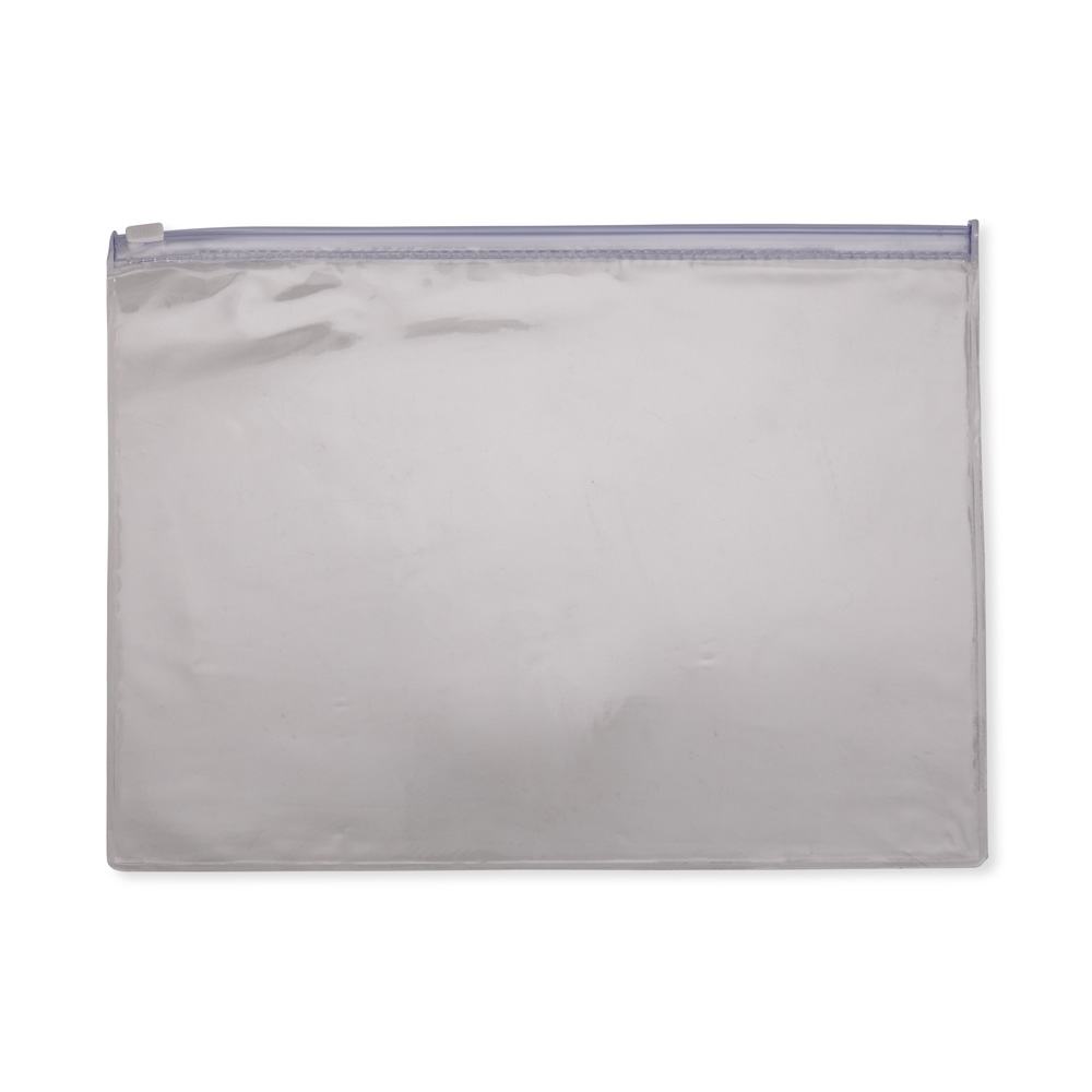 Pasta feita em plástico transparente com fechamento zip zap deslizante.