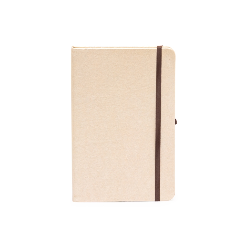 Caderneta de kraft com marca página em cetim e elástico para lacre. Contém aproximadamente 80 folhas marfim sem pauta.