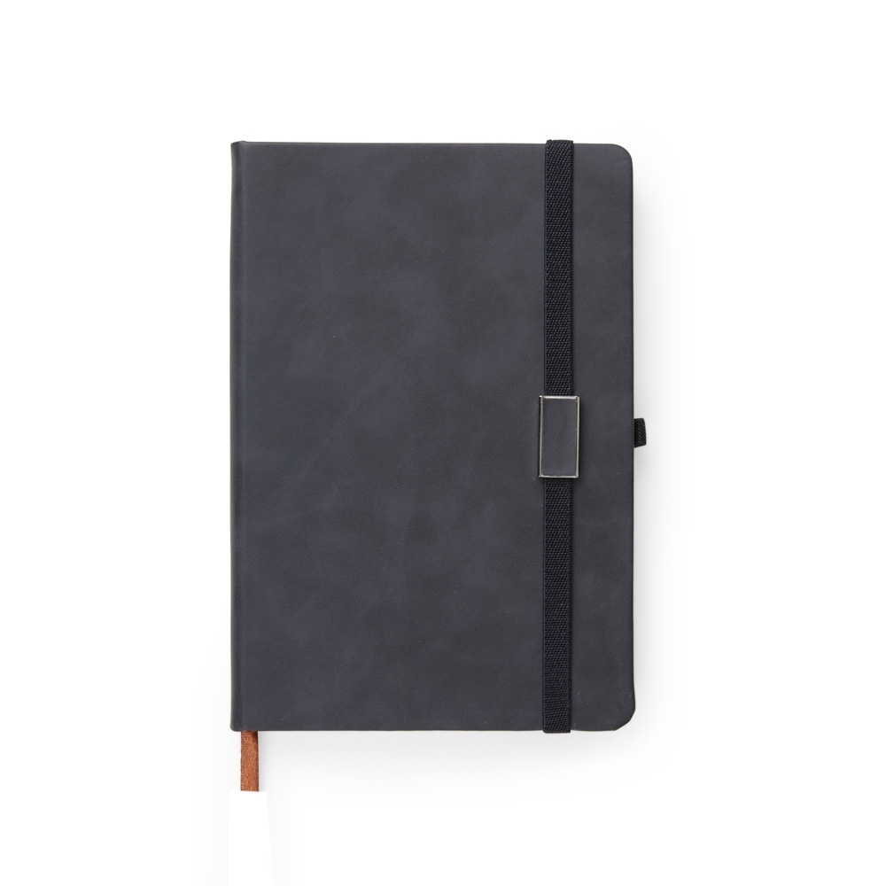 Caderneta emborrachada com elástico para lacre e marcador de página em cetim.