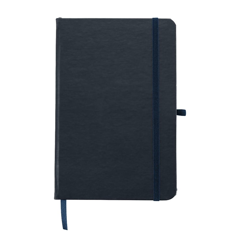 Caderno A5 com capa plástica e elástico para lacre, contém aproximadamente 80 folhas marfim com pauta.