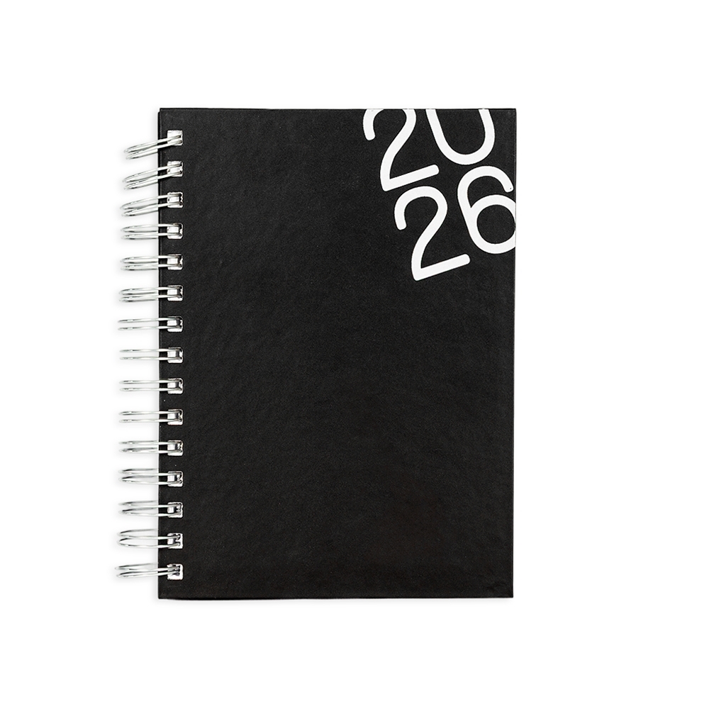 Agenda diária em capa dura, encadernação Wire-O, elástico de fechamento e marca-páginas em cetim. Contém ainda páginas dedicadas a dados pessoais, calendários de 2026 a 2028, planejamento mensal e lista de contatos.