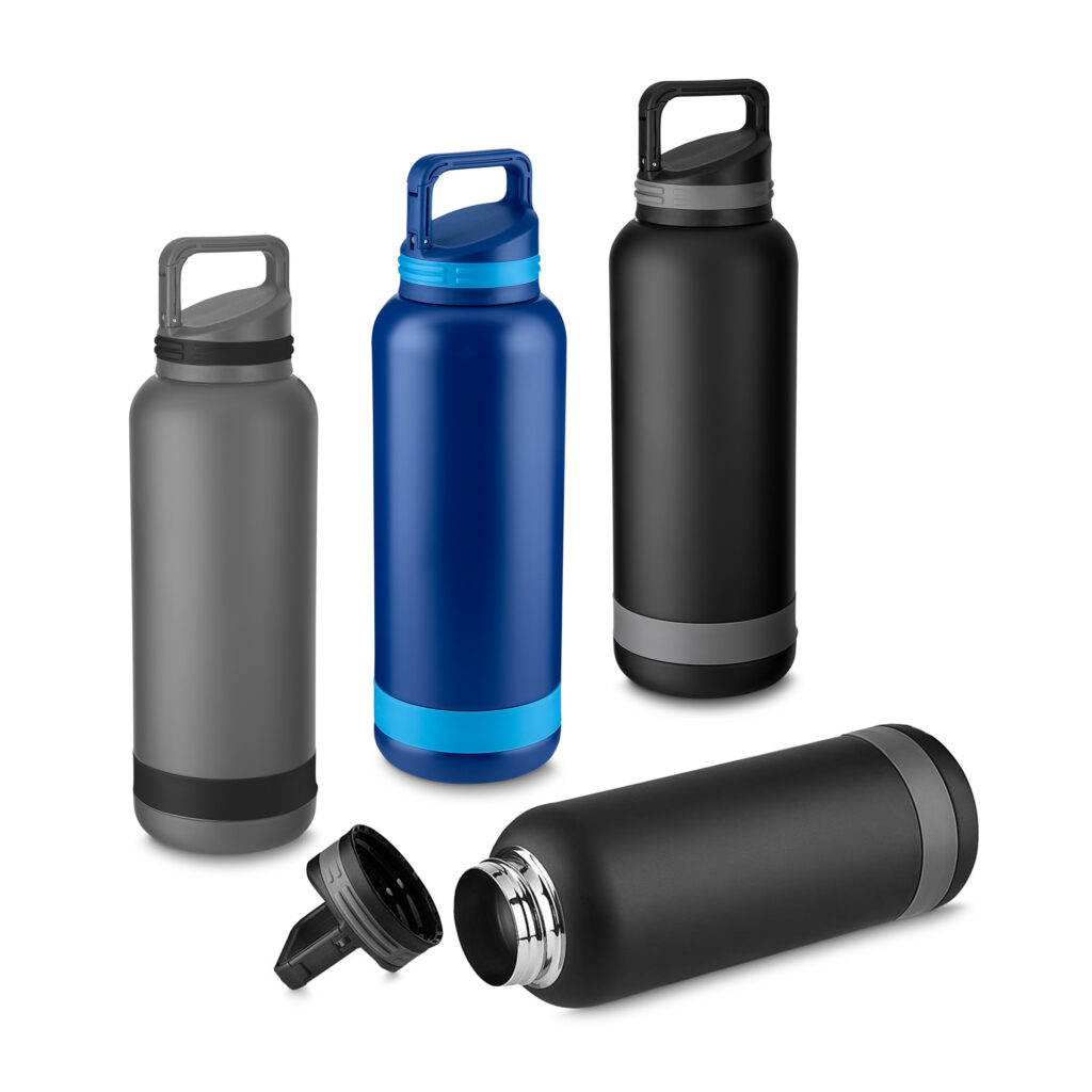 Garrafa térmica em aço inox com parede dupla isolada a vácuo, com capacidade de 950ml e conta com uma pintura a pó. Tampa rosqueável com e anel de silicone para vedação. Alça de transporte em plástico. Permite-se hidratar por canudo ou bico.