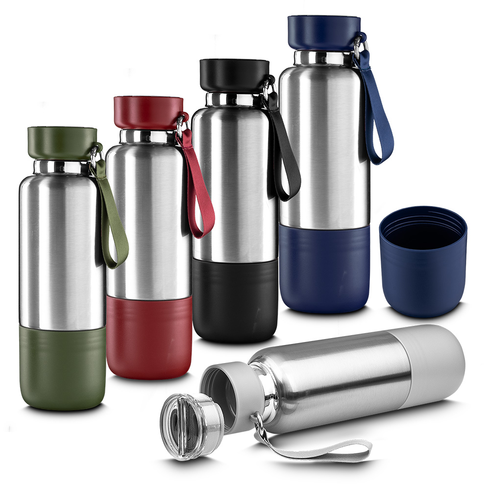 Garrafa térmica em aço inox com parede dupla isolada a vácuo, com capacidade de até 650ml e com parede externa com pintura a pó. Tampa rosqueável com anel de silicone para vedação. Alça de transporte em plástico. Permite-se hidratar por canudo ou bico.