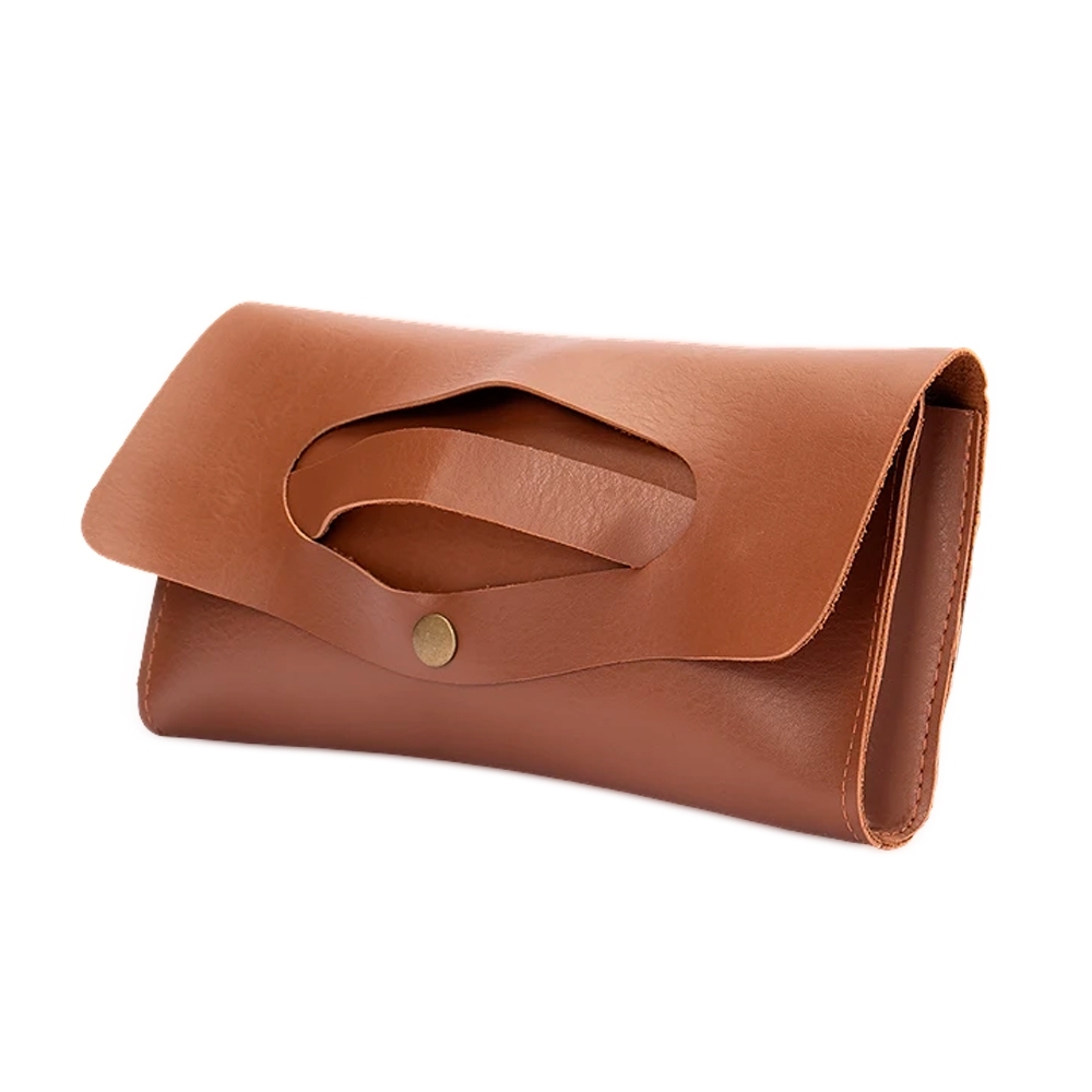 Carteira de mão com alça para transporte. Confeccionada em couro sintético, possui revestimento interno com textura aveludada e fechamento por botão de pressão.