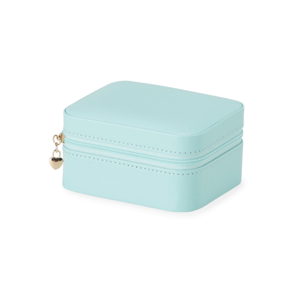 Porta-joias arredondado feito em couro sintético com revestimento aveludado e fechamento em zíper. Possui bolso elástico e três ganchos pequenos na parte interna da tampa, além de divisória multiuso e repartição almofadada com ranhuras para anéis, ambos localizadas no compartimento principal.