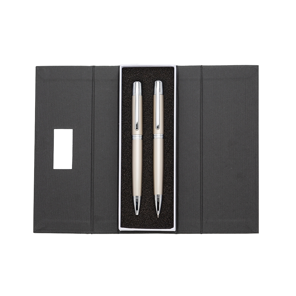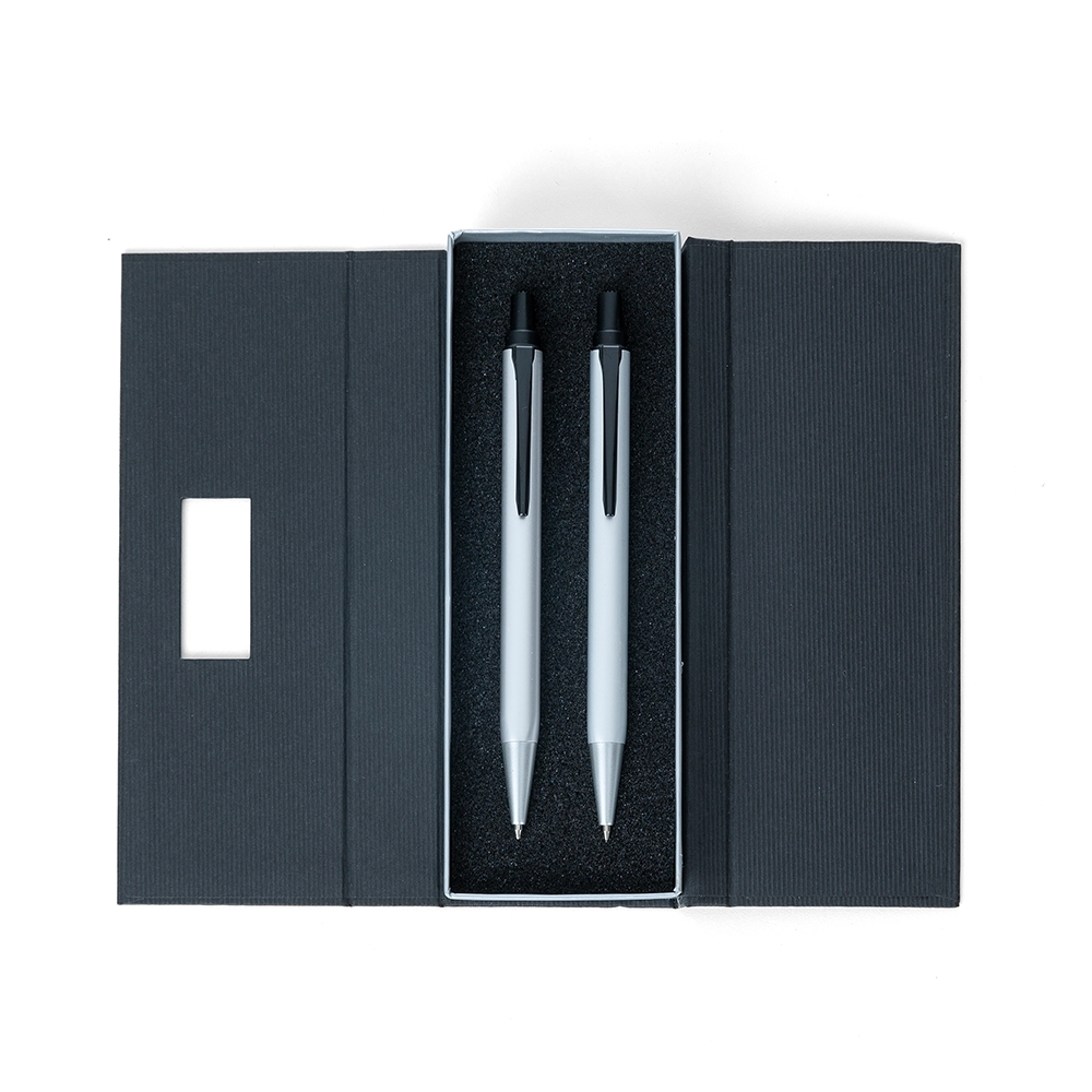 Conjunto caneta e lapiseira em estojo de cartonagem com placa central para personalização. Caneta/Lapiseira metal prata com detalhes diferenciados na parte inferior, clip metal com detalhe de linha no centro. Acionam por giro. Estojo revestido com espuma na parte interna.