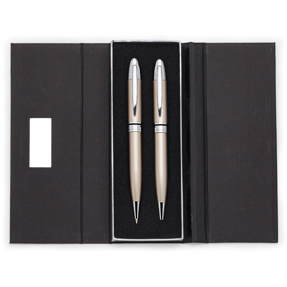 Conjunto caneta e lapiseira em estojo de cartonagem com placa central para personalização. Clip metal com dois anéis em relevo, anel centralizado e dois anéis em relevo na ponteira e acionam por giro. Estojo revestida com espuma na parte interna.