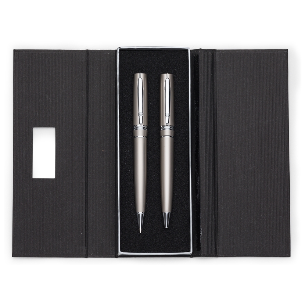 Conjunto caneta e lapiseira em estojo de cartonagem com placa central para personalização. Caneta/Lapiseira metal inteira colorida com detalhes prata, clip metal com duas “linhas” e na “ponta” superior detalhe de uma linha no meio. Possui três anéis abaixo do clip, anel centralizado e anel inferior e acionam por giro. Estojo revestida com espuma na parte interna.