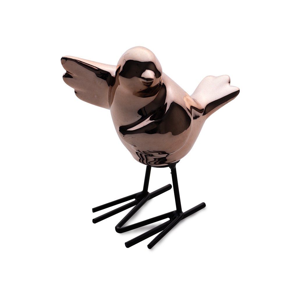 Enfeite decorativo de porcelana em formato de passarinho com pés de ferro.