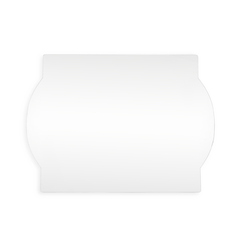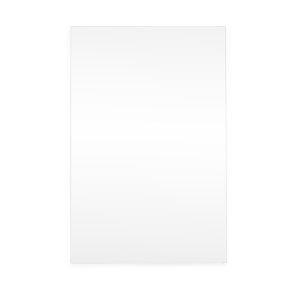 Espelho em acrílico com formato retangular e fundo adesivo para fixação em superfícies planas.