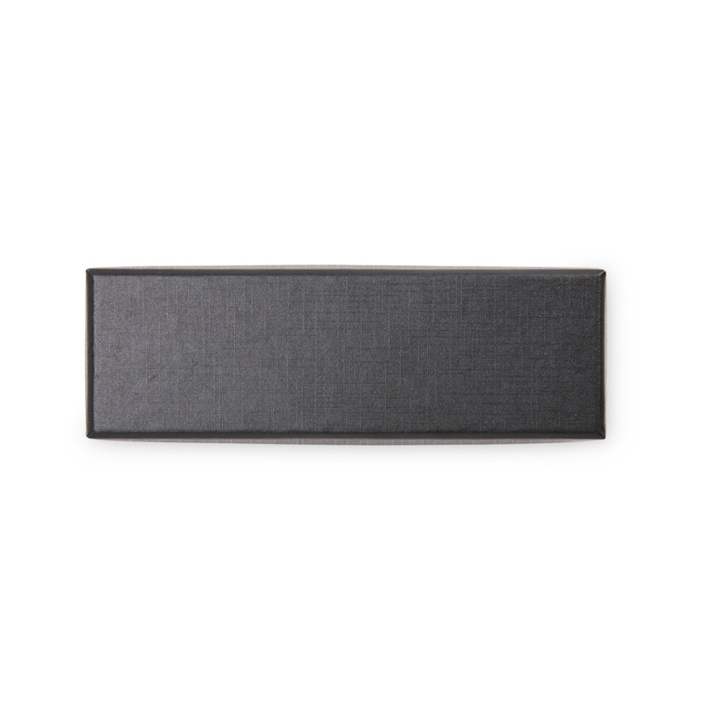 Estojo em papelão com abertura estilo gaveta e berço aveludado e elástico para fixar uma caneta.