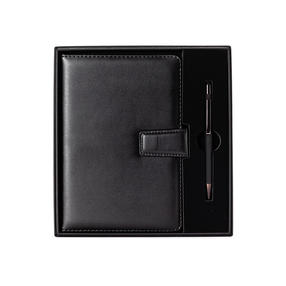Kit executivo com duas peças, composto por uma caderneta de capa em couro sintético com fechamento magnético e cerca de 80 folhas pautadas, e uma caneta em metal com detalhes em plástico, ponteira emborrachada para uso em dispositivos touchscreen e carga esferográfica azul de 1,0 mm. Acompanha uma caixa de papelão com berço em espuma para a caneta.