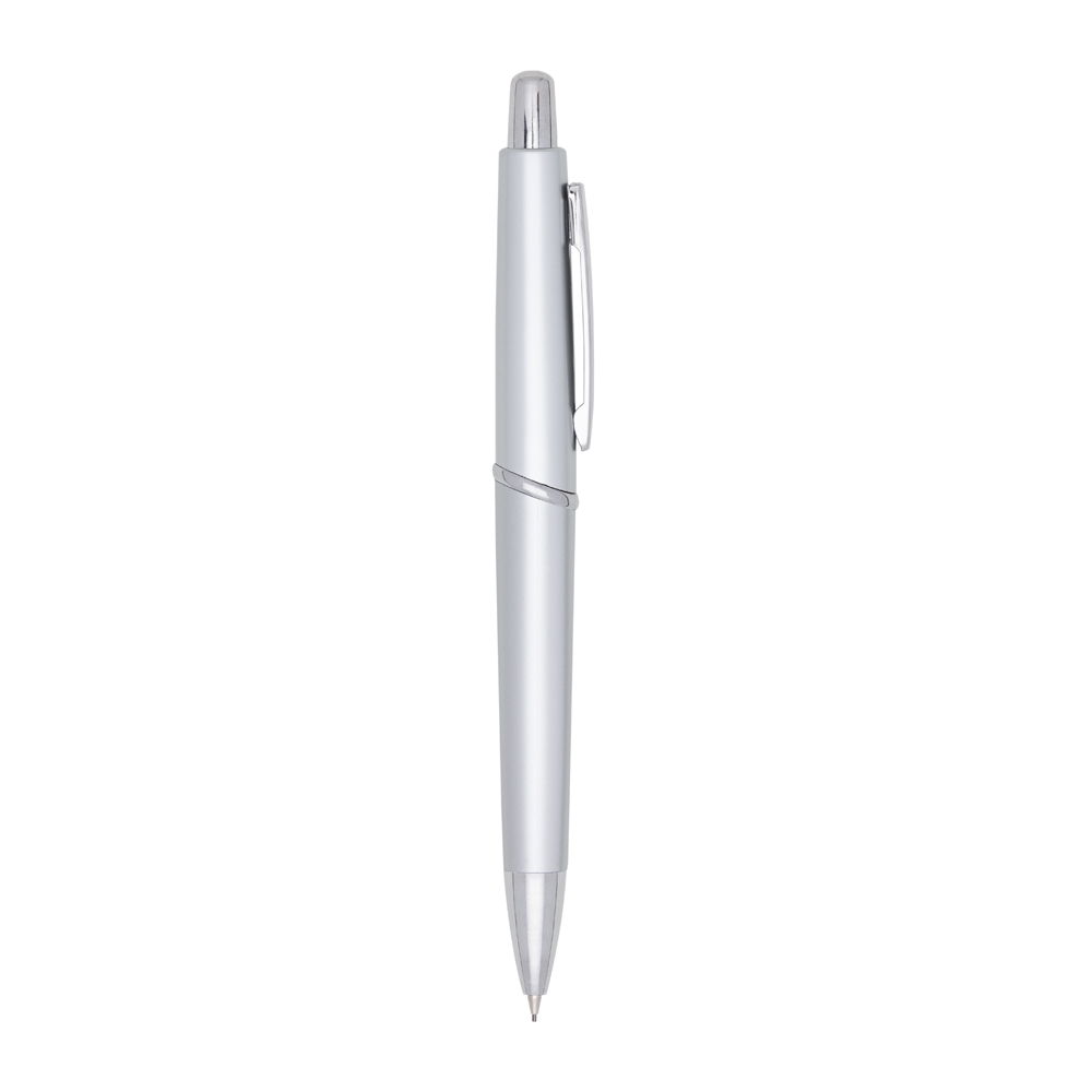 Lapiseira plástica prata com detalhes coloridos translúcidos. Clip de metal, aciona por clique.