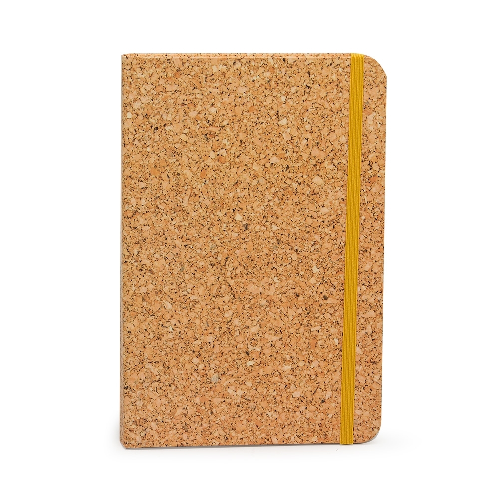 Caderneta de cortiça, contém aproximadamente 80 folhas amarelas com pauta, marcador de página em cetim e elástico para lacre.