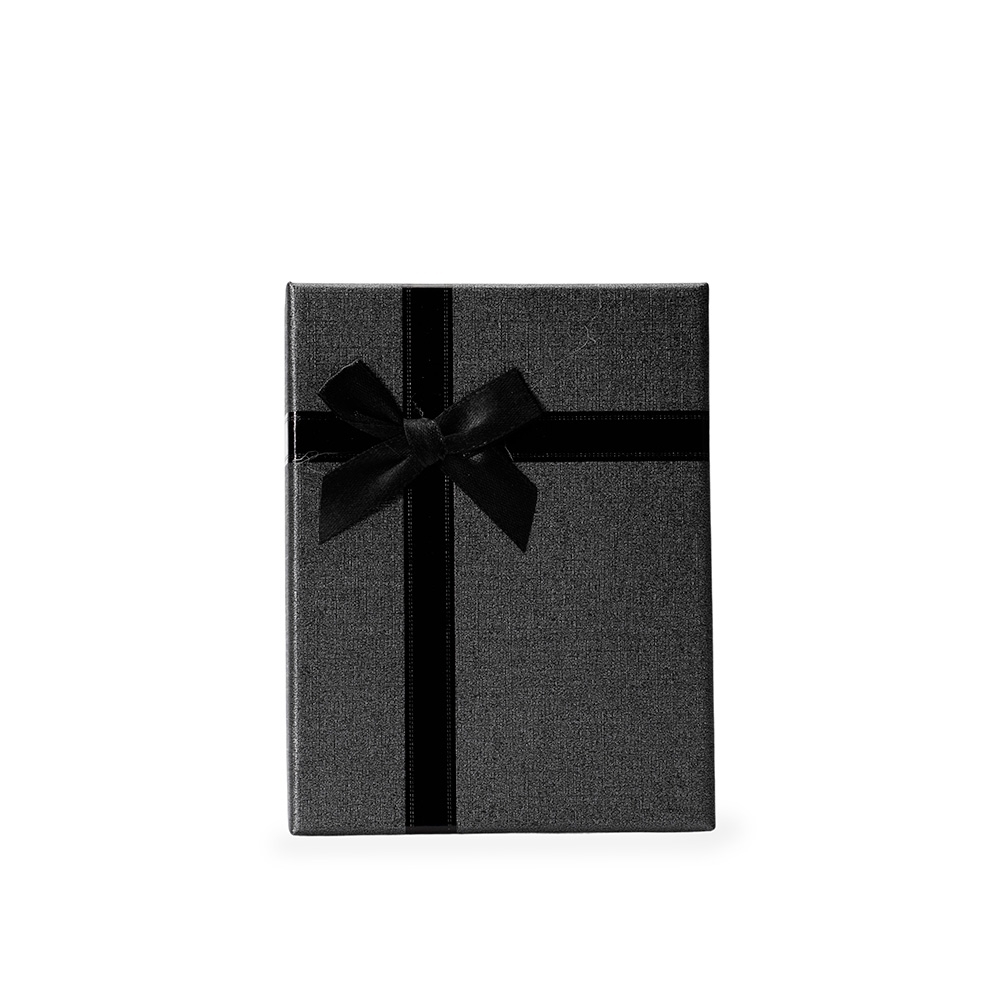 Caixa para presente feita em papelão com acabamento levemente texturizado e laço decorativo colado diretamente na tampa. Conta ainda com berço removível em espuma com ranhuras.