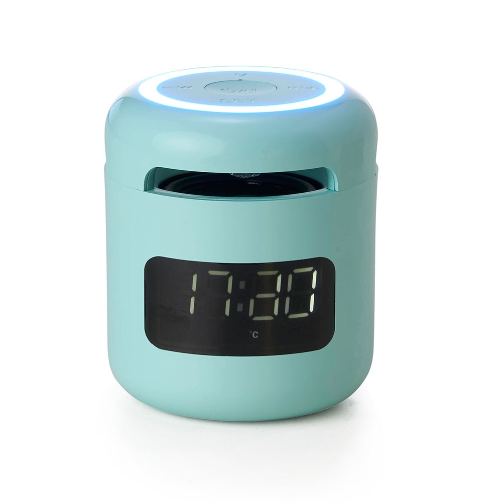Caixa de som multimídia com relógio despertador. Produzida em plástico e com borrachas antiderrapantes na área inferior, a caixa de som tem bateria de longa duração, display de LED na área frontal, e anel de led brilhante na parte superior. A caixa de som executa nos modos bluetooth, rádio FM, cartão TF-microSD e entrada auxiliar P2. Acompanha cabo USB e manual em inglês e chinês.