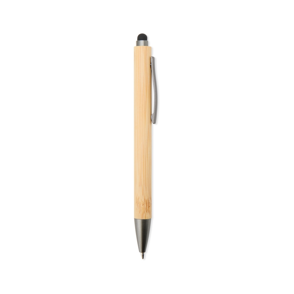 Caneta com corpo em bambu, acionador em bambu com detalhe plástico, ponteira e clipe cromado.